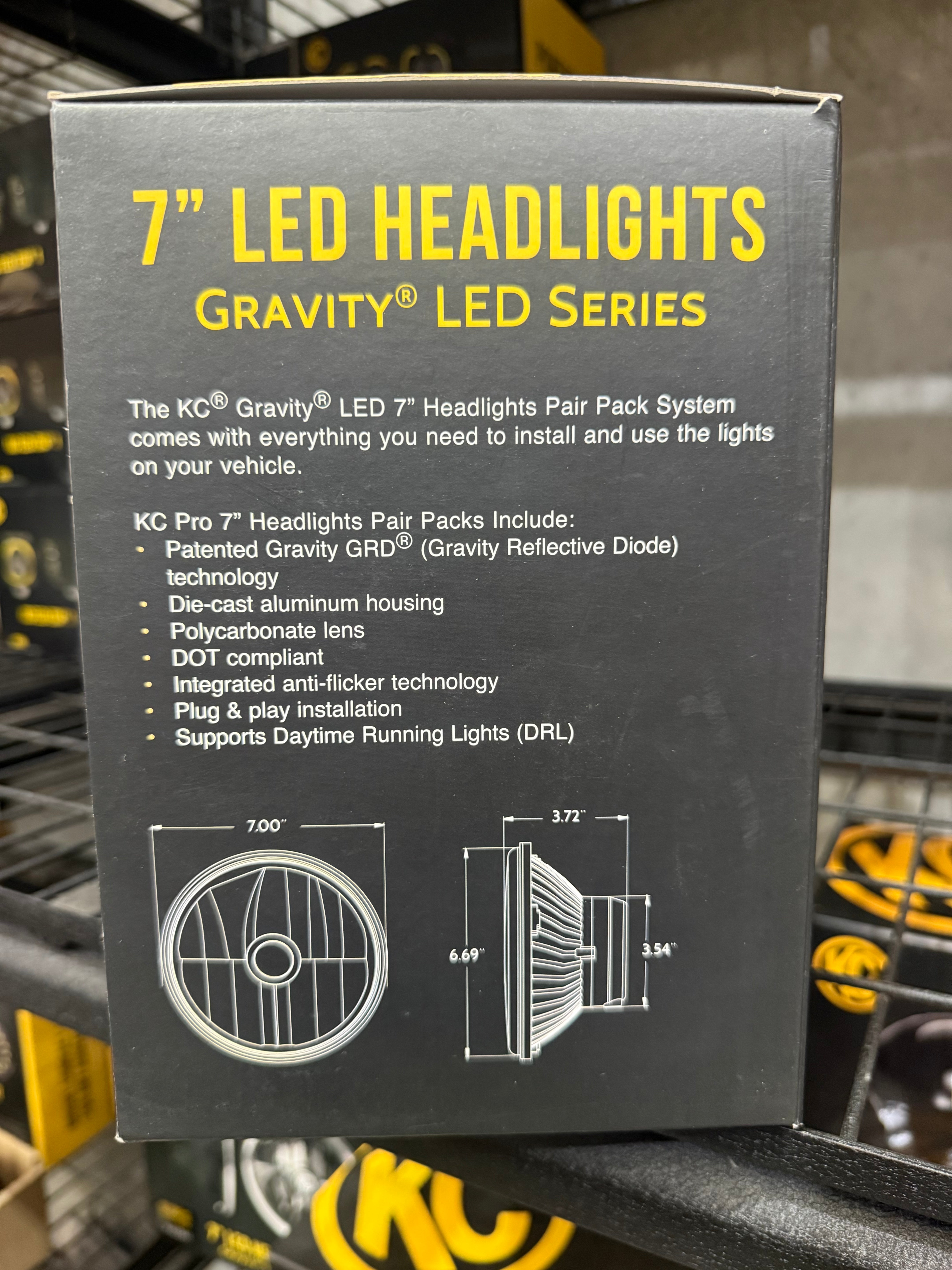 KC HiLiTES Gravity LED 7" Headlight replacement features CREE LEDs for DOT low/high beams. Die cast aluminium housing and polycarbonate lens for optimal performance.